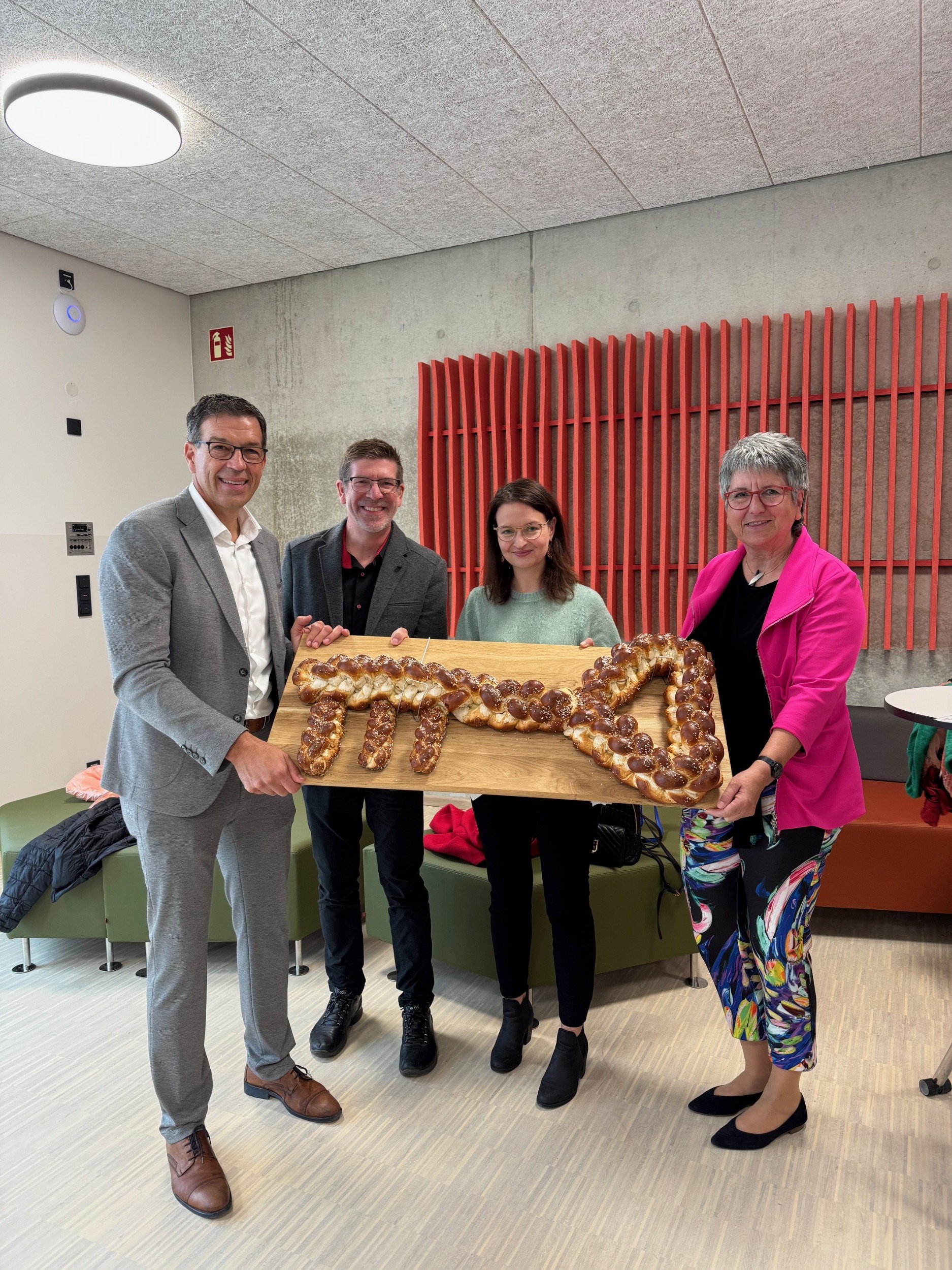 Pünktlich zum Start des neuen Schuljahres nimmt der Erweiterungsbau für die Grudschule in Lonsee den Betrieb auf. Florian Enz (LMJD Architekten) überreichte im Rahmen der Eröffnungsfeier Herrn Bürgermeister Ogger (links), Frau Kemmer (MdB) und der Schulleiterin, Frau Patzwaldt (rechts) den symbolischen Brezenschlüssel.