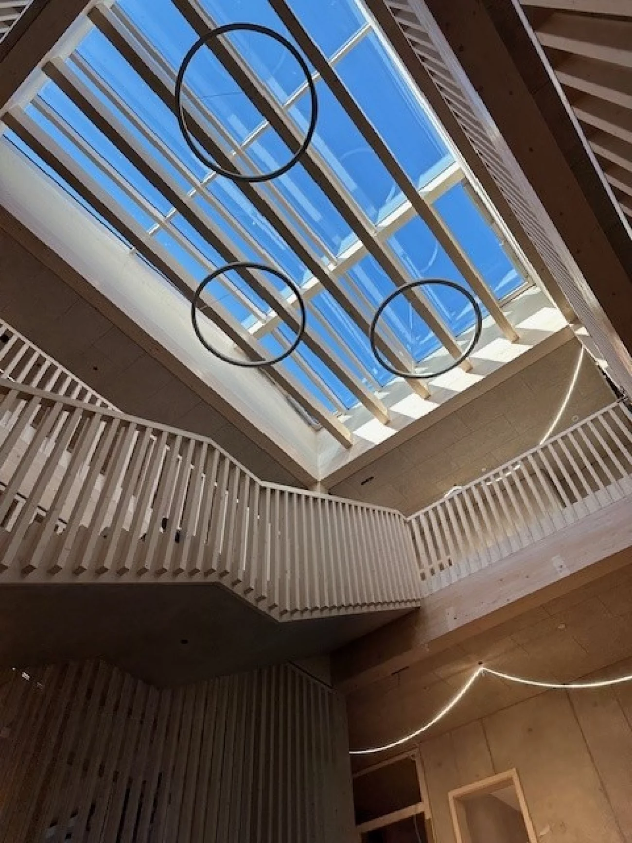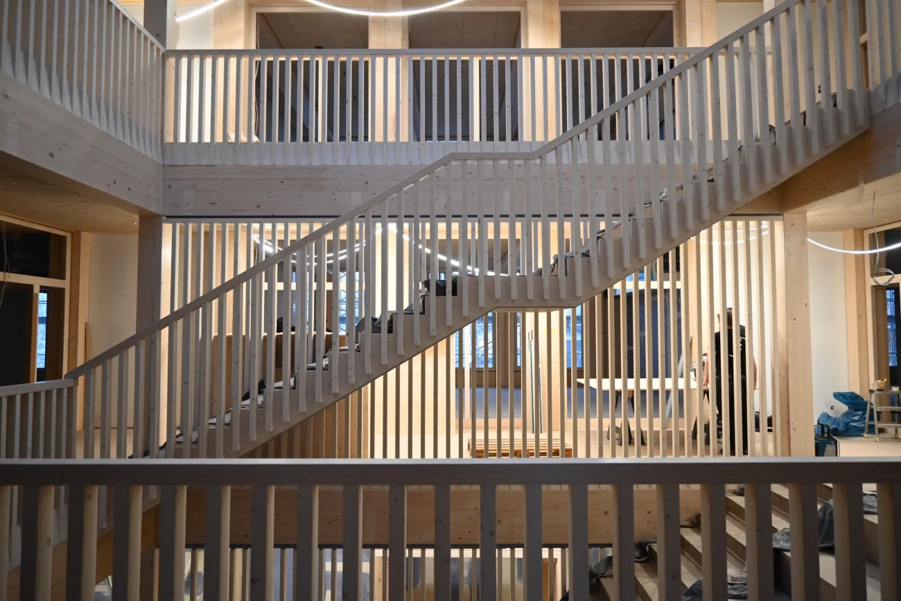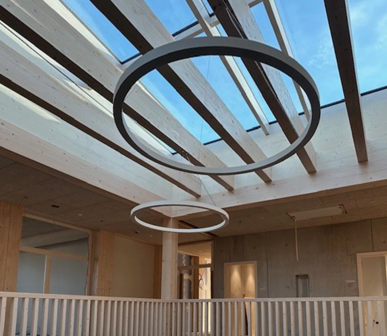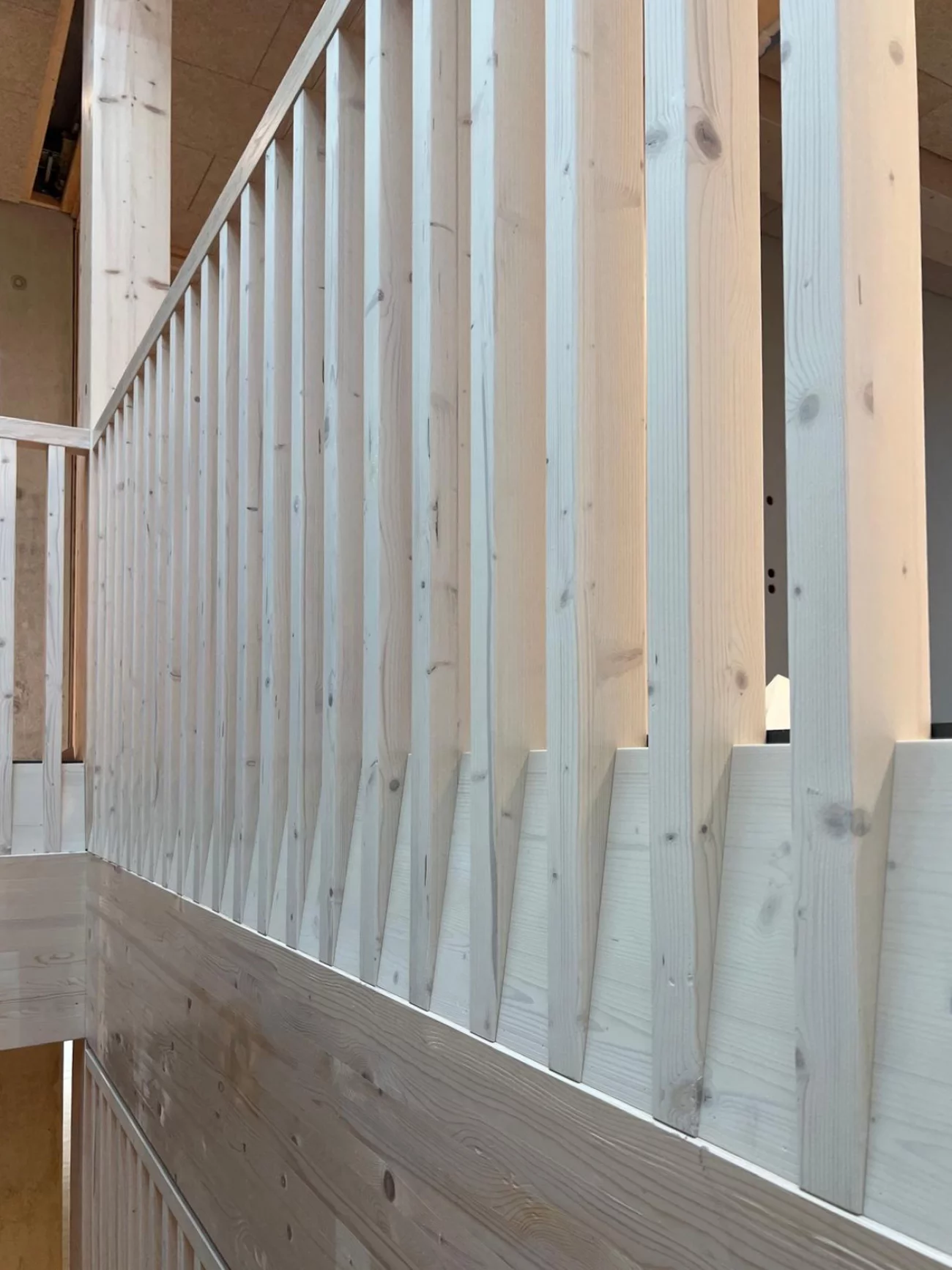 Die gewählte modulare Bauweise bestehend aus Holzstützen und Holzunterzügen im 2.50m Raster und Betonfertigteilen ermöglicht einen hohen Vorfertigungsgrad. Die schnelle Bauzeit bietet viele Vorteile für die beengten Grundstücksverhältnisse. Zwei Kerne aus Ortbeton sowie nord-und südseitige Brettsperrholzwände dienen zur Aussteifung des Gebäudes. Die 2.50m breiten Flurzonen werden lediglich mittels 12cm dicker Fertigteile überspannt und bieten somit ausreichend Installationsraum für die Haustechnik. Im Untergeschoss wird gezielt Recyclingbeton eingesetzt. Die Holzstützen und Unterzüge bleiben sichtbar und werden zum gestalprägendem Elemt im Innnraum. Die Fassadengestaltung in Holz spiegelt den Holzbau auch nach außen wieder.
