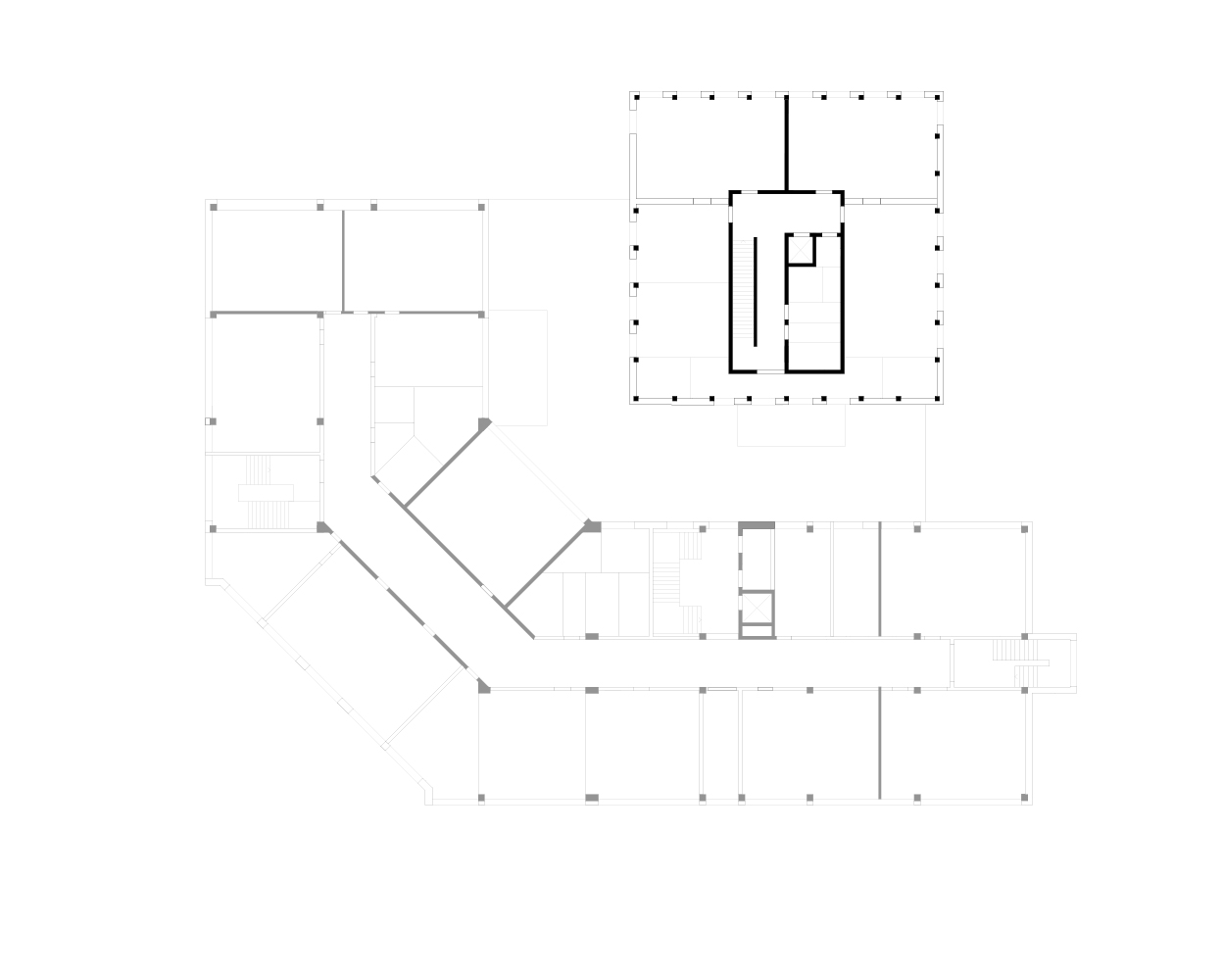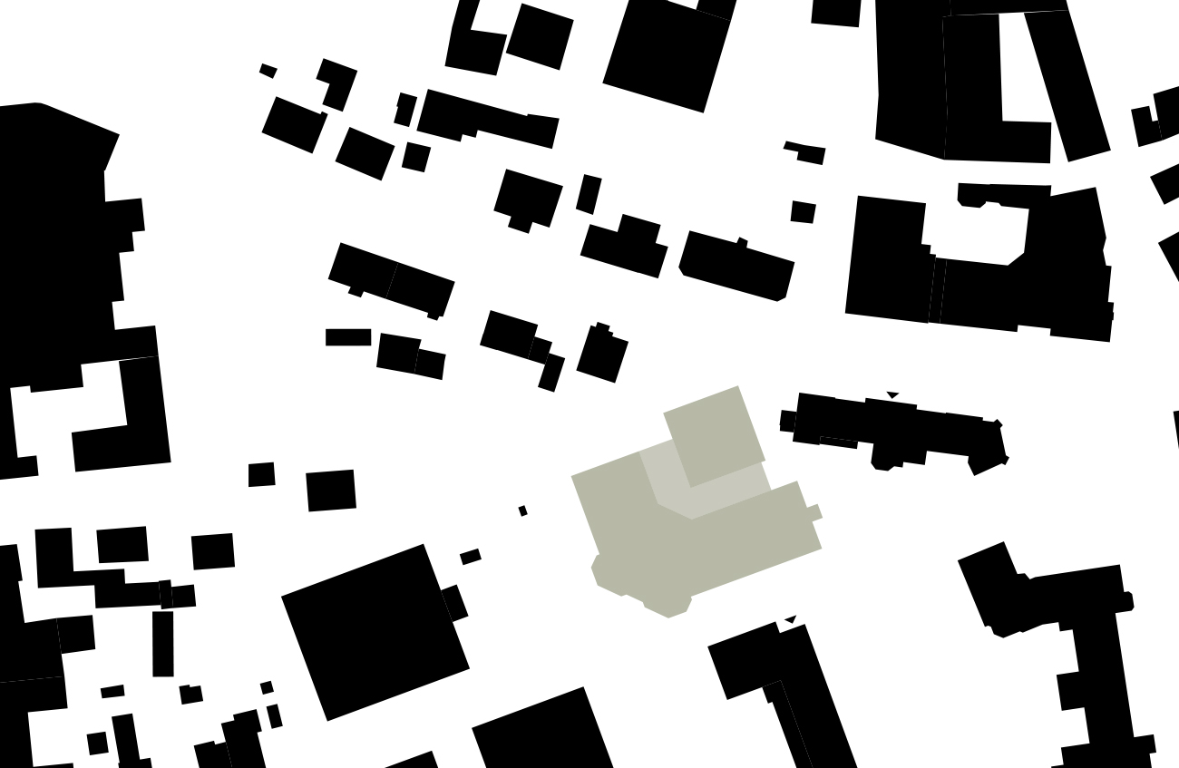 An das bestehende Gebäude der Wirtschaftsschule wird unter Wegnehmen des eingeschossigen Eingangsbereichs, ein durchgehendes eingeschossiges Sockelgeschoss sowie ein dreigeschossiger Neubau vorgesehen. Die Obergeschosse ragen als Solitär über das Sockelgeschoss hinaus.