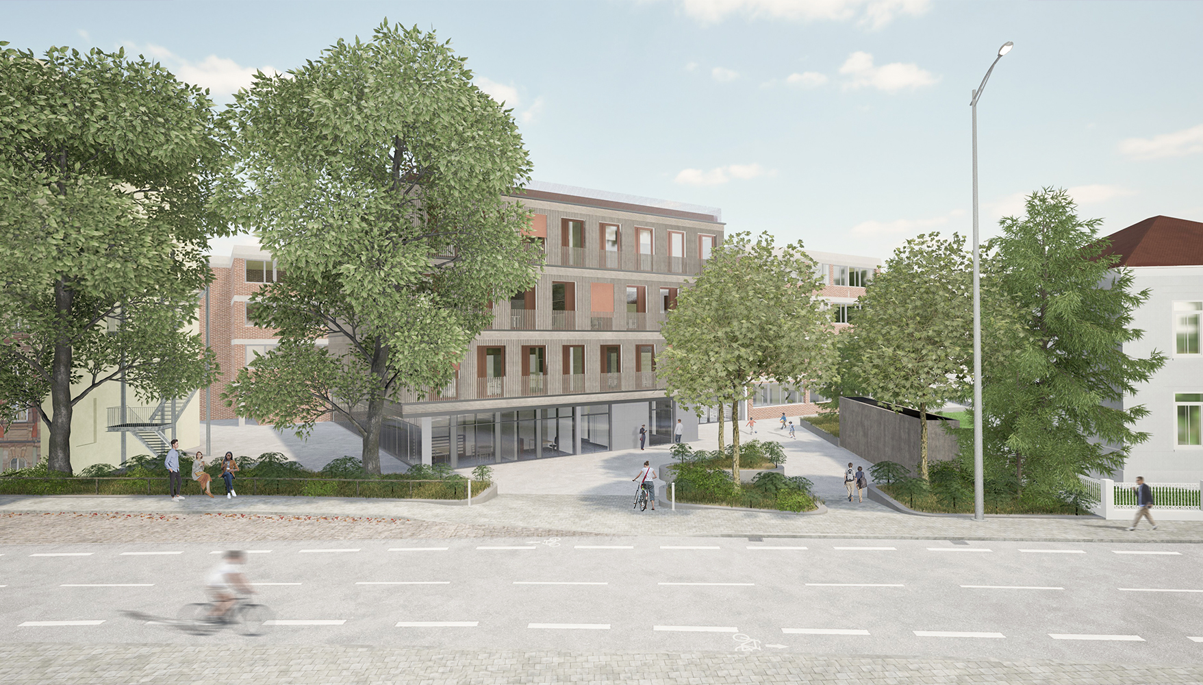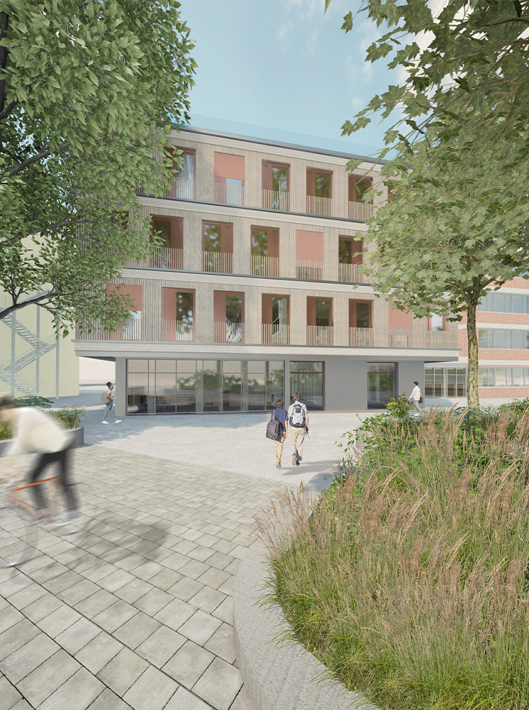 Um der bei Schulbauten aus funktionalen Gründen erforderlichen Versiegelung der Pausenflächen vorzubeugen, werden die Dächer vorwiegend als Biodiversitätsdach und somit als Ersatzlebensraum für Flora und Fauna vorgesehen. Die zudem vorgesehenen fassadenintegrierten Nistkästen für Vögel und Fledermäuse sollen zum Erhalt der Artenvielfalt beitragen. Eine Fassadenbegrünung mit Rankhilfen wird an der Südfassade der Wirtschaftsschule ebenfalls vorgeschlagen. Damit wird zum einen eine grüne Pufferzone etabliert, die Aufenthaltsqualität optimiert, sowie die Abstrahlflächen der Gebäudeaußenhaut reduziert.