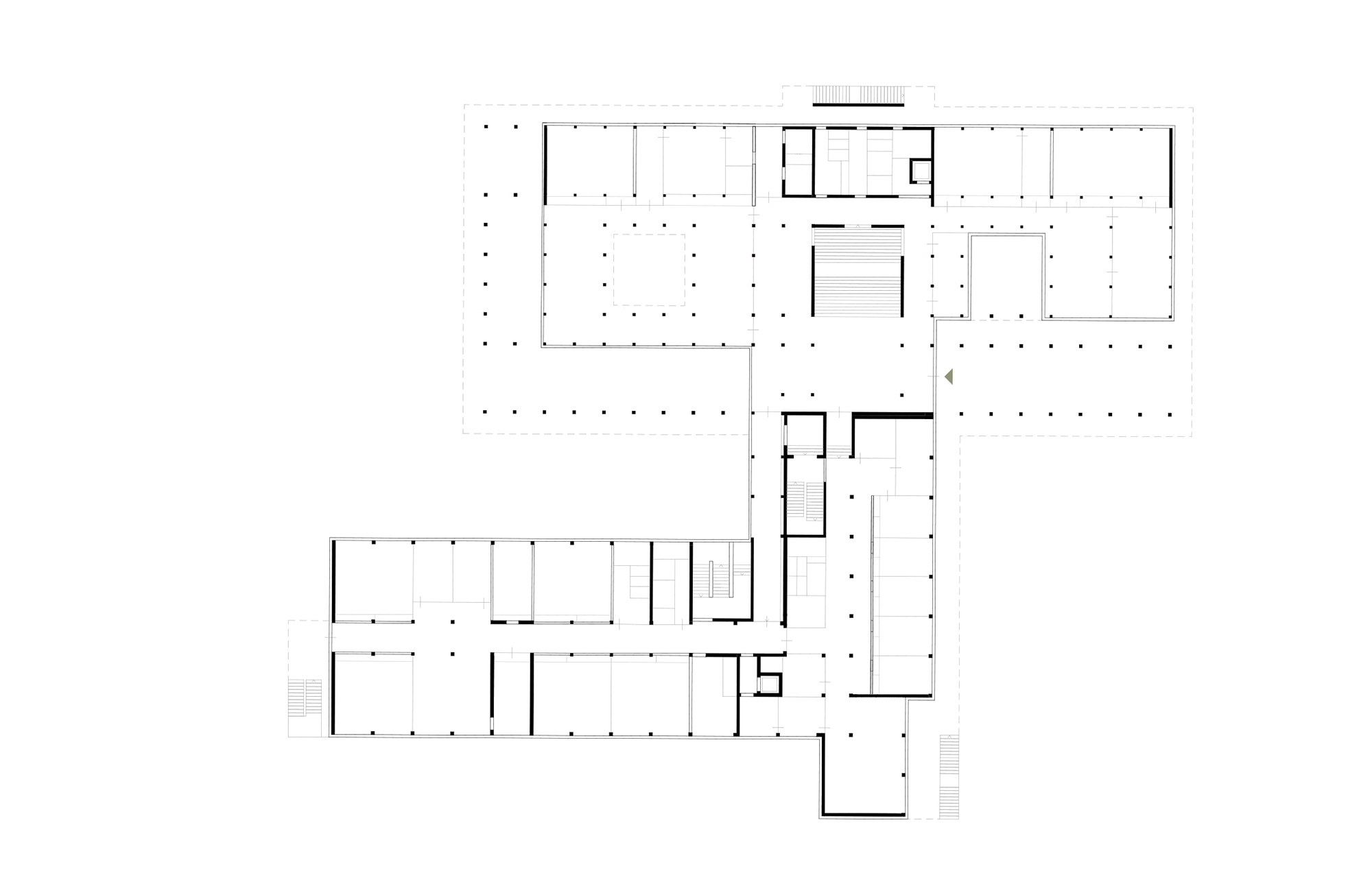 Über eine zentrale Treppe gelangt man in die Obergeschosse, die im Neubau die Lernwohnung der Grundschule (OG1) und Mittelschule (OG2) abbilden.