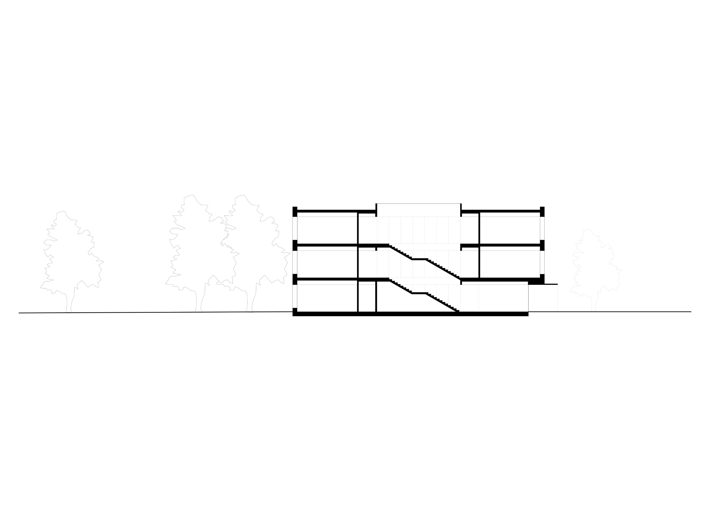 Aus der Nutzung und den oben genannten Parametern ergibt sich ein dreigeschossiges, kubisches Gebäude, welches sich in der Süd-Ost Ecke platziert und den Baumbestand im Süden weitestgehend erhält. Der Baumbestand im Osten muss aufgrund eines im Untergrund vorhandenen Löschwasserbeckens (für Löschzwecke der angrenzenden Baudenkmäler) weichen, da das Becken ausgebaut werden muss. In der Nord-West Ecke ergibt sich ein großzügiger Freibereich, welcher der Straßenseite abgewandt ist.