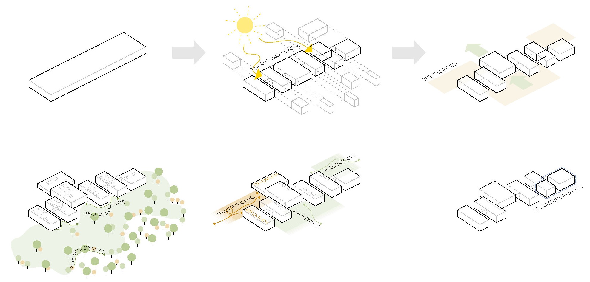 Die Pausen- und Sportaußenflächen sollen lärmabgewandt im östlichen Teil des Wettbewerbsgebiets so angeordnet sein, dass die Sportflächen auch in den Pausen zur Bewegung und zum Spielen genutzt werden können. Neben einem grünen Klassenzimmer, das auch für Freiluftveranstaltungen, wie z.B. Theater-aufführungen, genutzt werden kann, und einem Bewegungspfad/-bereich soll ein Schulgarten mit Regenwasserentnahmestelle vorgesehen werden. Zusätzlich dient ein Lerngarten mit ausreichenden Sitz- und Liegemöglichkeiten in der Pause zur Erholung.